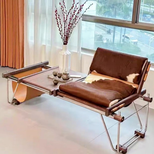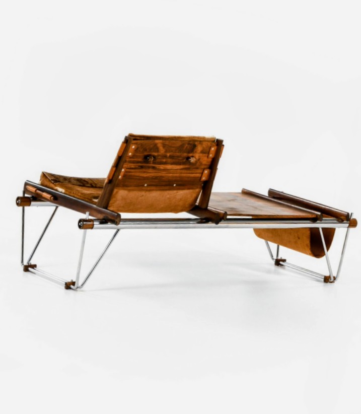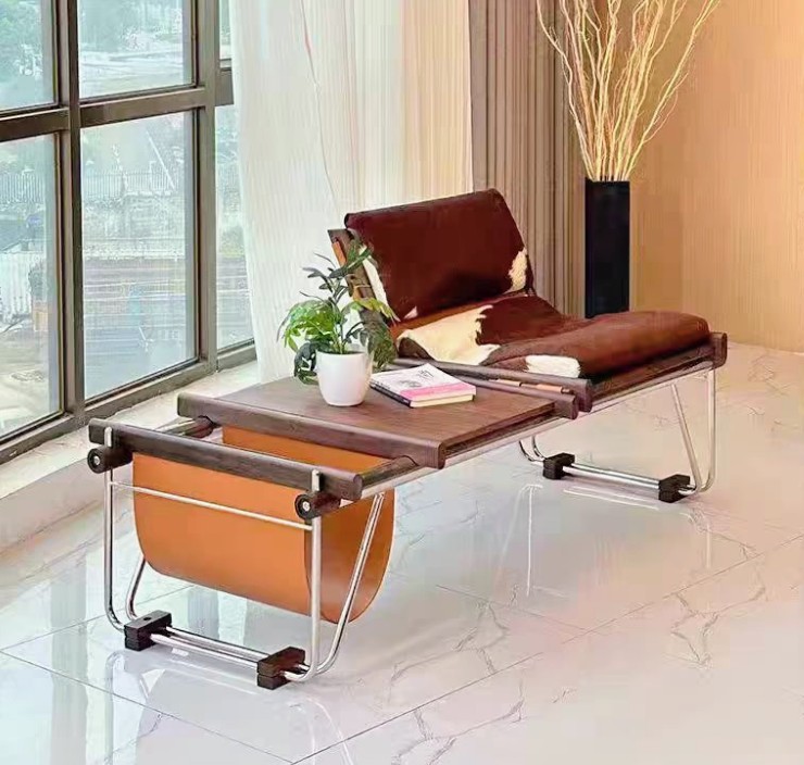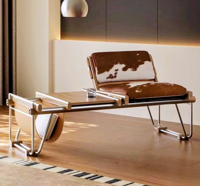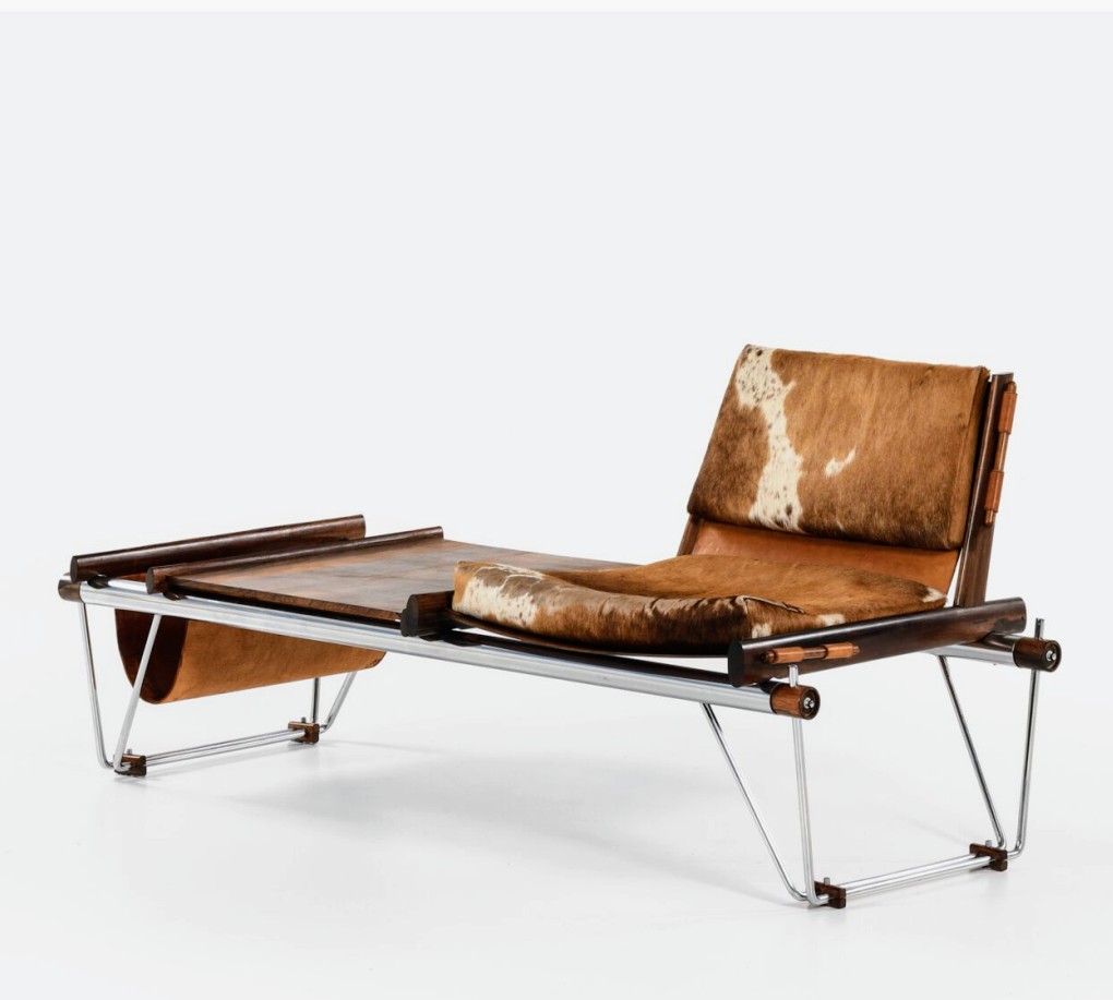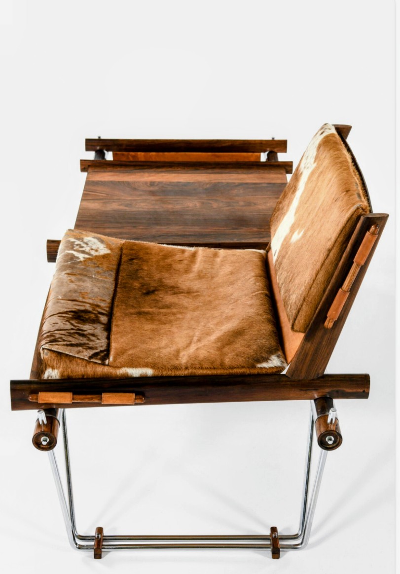 The interplay of chrome, rosewood, leather, and cowhide demonstrates Lafer’s tactile